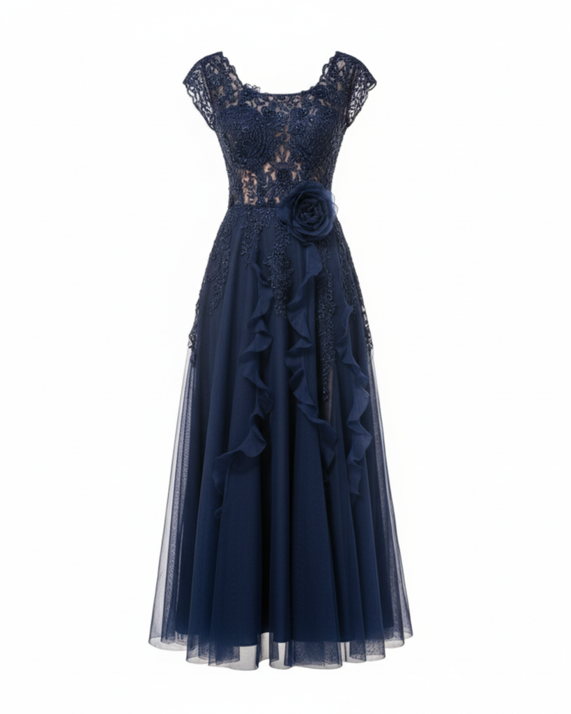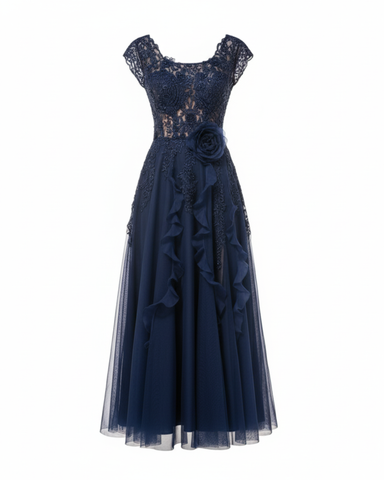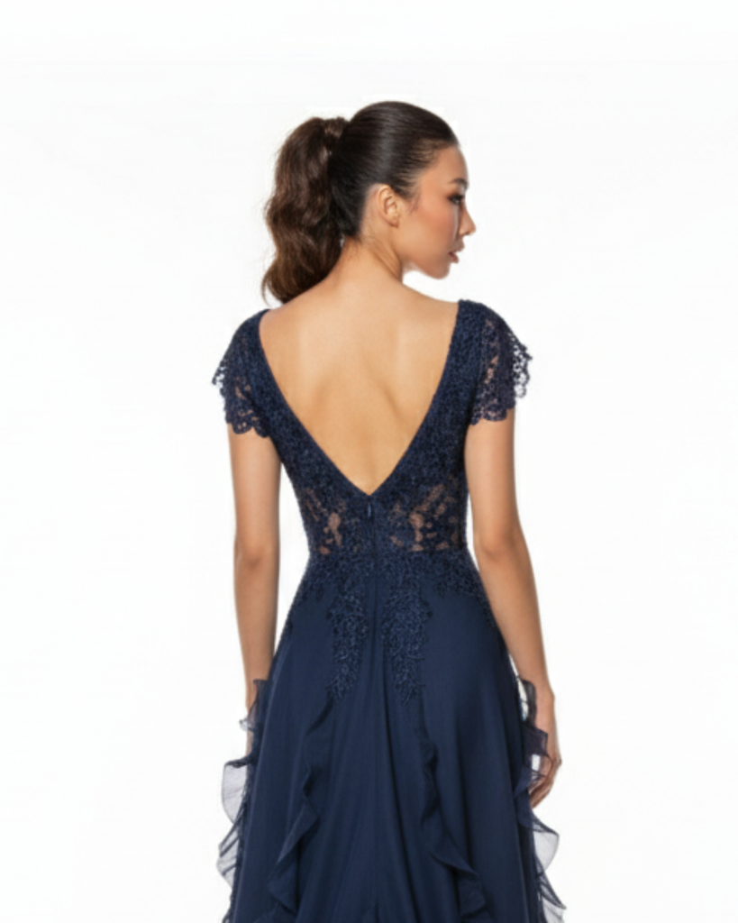 Exclusive luxury dress with structured bodice on skin-tone base, hand-embroidered tulle with subtle shimmer. Bell-shaped skirt featuring serpentine gauze ruffles that create mesmerizing movement.