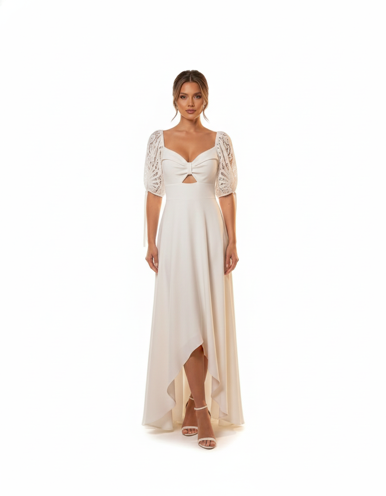 Vestido en el tono emblemático Cloud Dancer (Color del Año Pantone 2026), que combina una silueta fluida con detalles románticos que capturan todas las miradas. Escote tipo corazón con detalle de nudo central y sutil recorte que añade un toque juvenil y moderno. Mangas cortas abullonadas confeccionadas en delicado encaje calado, que aportan un aire bohemio y romántico. Falda de corte evasé con bajo asimétrico alto-bajo, más corta al frente, permitiendo lucir el calzado y facilitar el movimiento. Confeccionado en tejido fluido con caída impecable, una pieza única que aporta luminosidad y sofisticación.