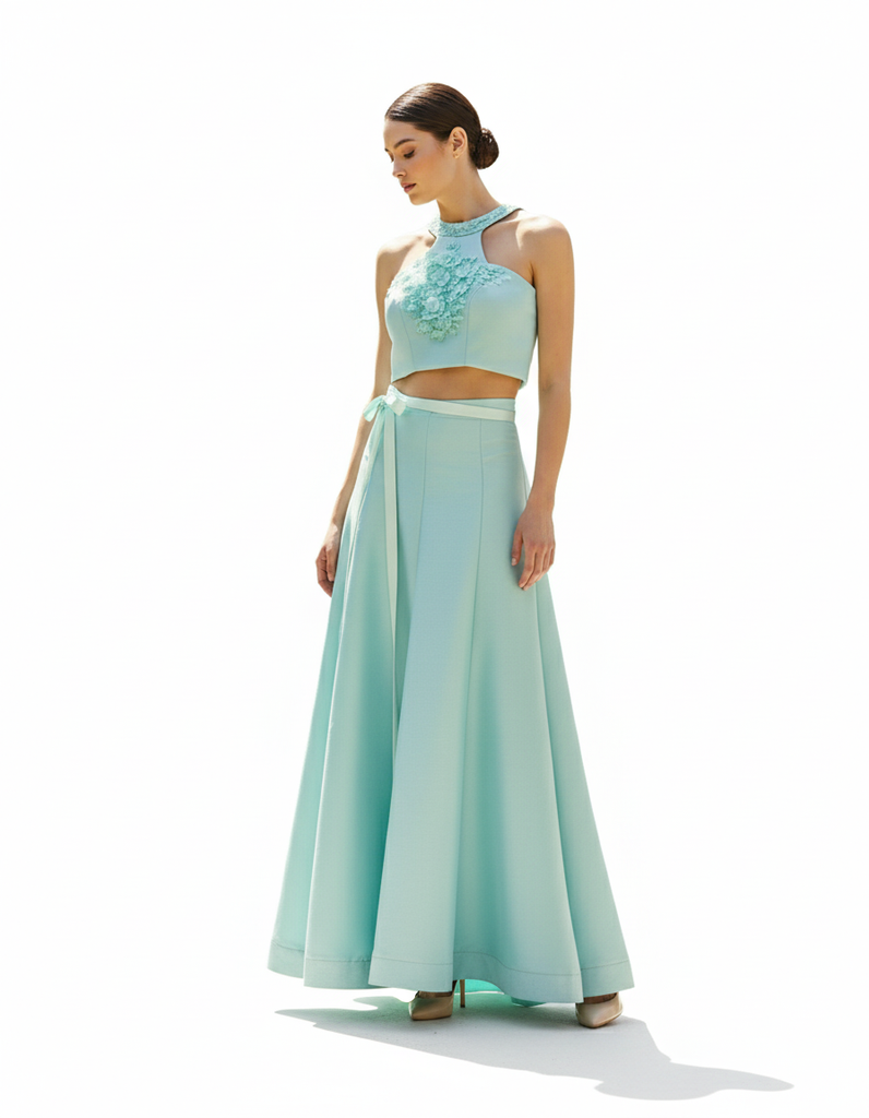 Un diseño exclusivo de Soraya Bittar, este vestido largo de dos piezas es la máxima expresión de la elegancia moderna. Confeccionado en Shantung, presenta un escote Halter bordado a mano con cristales para un brillo deslumbrante. Aplicaciones con delicadas flores en 3D le otorgan un toque de distinción y romanticismo, ideal para celebraciones especiales.