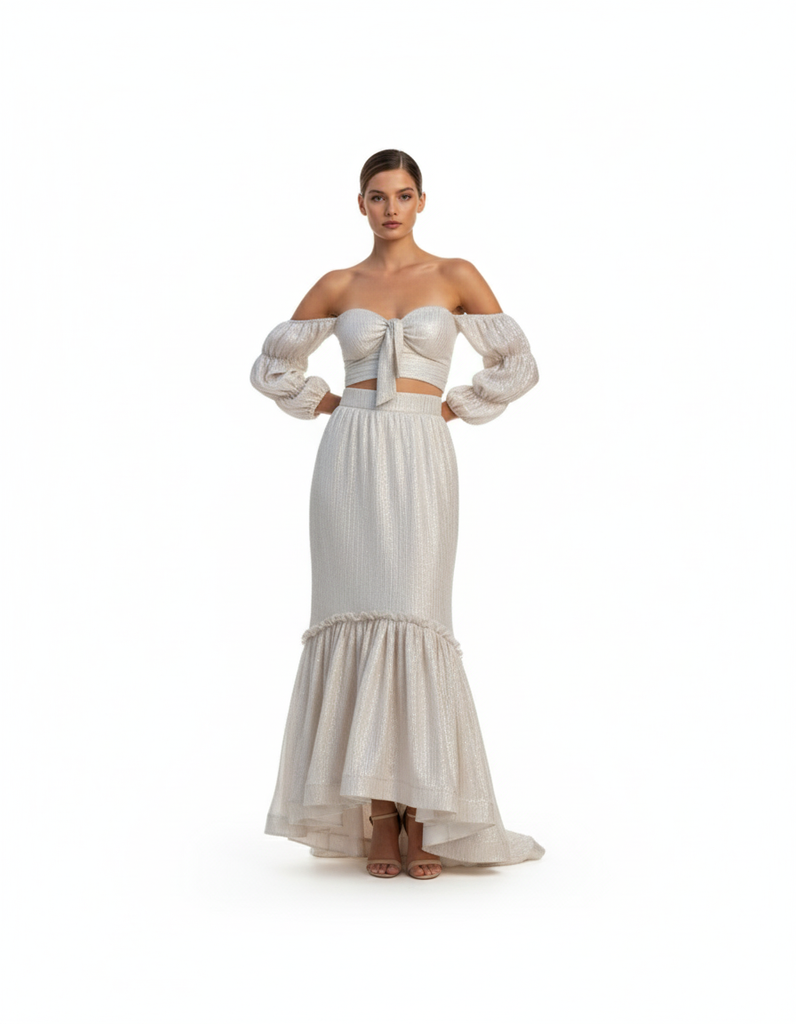Diseño exclusivo de Soraya Bittar, este espectacular vestido de dos piezas es la máxima expresión de elegancia atemporal con un toque de modernidad. Elaborado en seda laminada con hilo de plata, la prenda brilla con un brillo sutil y sofisticado en cada movimiento. La silueta de dos piezas ofrece una versatilidad audaz, perfecta para quienes desean dejar una impresión inolvidable.