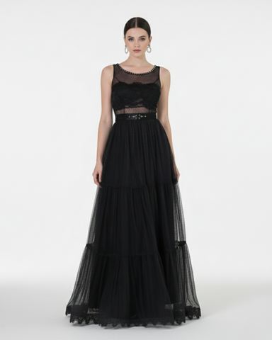 Un cinturón integrado en tela satinada con hebilla enjoyada central marca la silueta y sirve de transición perfecta hacia el volumen de la falda. La falda de gala destaca por sus múltiples niveles de tul que proporcionan un movimiento ligero y un volumen imponente, con un acabado de encaje en el ruedo que completa esta pieza única.