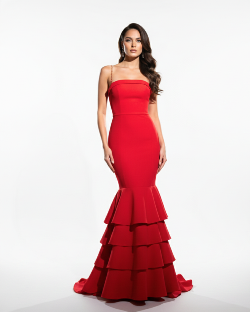 Vestido con corte sirena ultra-entallado que desemboca en una falda de cuatro niveles de volados escalonados. Escote recto con delicado tirante fina con perlas tono dorado. Confeccionado en crepé que mantiene la estructura arquitectónica de los volados. Falda escultural que aporta movimiento y presencia imponente, con detalle de joyería integrada al tirante que eleva el diseño minimalista, una pieza única para eventos de gala.
