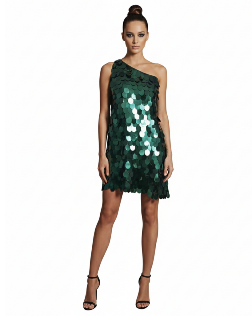 Mini vestido asimétrico de paillettes (lentejuelas) de gran formato, creando una textura visualmente impactante. Superficie recubierta íntegramente por discos metálicos solapados que aportan una dimensión tridimensional y un movimiento de luz inigualable. Diseño asimétrico de un solo hombro que aporta una línea limpia y contemporánea. Silueta recta diseñada para destacar la caída y el brillo del tejido esmeralda. Una pieza única donde la precisión técnica se une al diseño de vanguardia para galas modernas, cócteles de alto nivel y eventos de impacto.